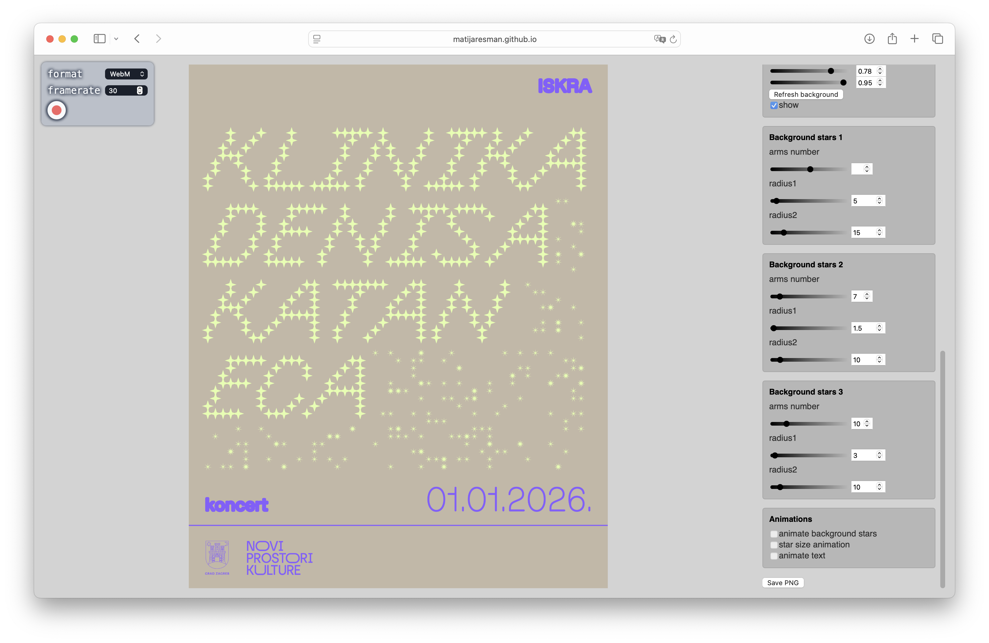 A web-based generative typographic tool developed for Iskra, an (as yet unopened) concert venue in Zagreb.